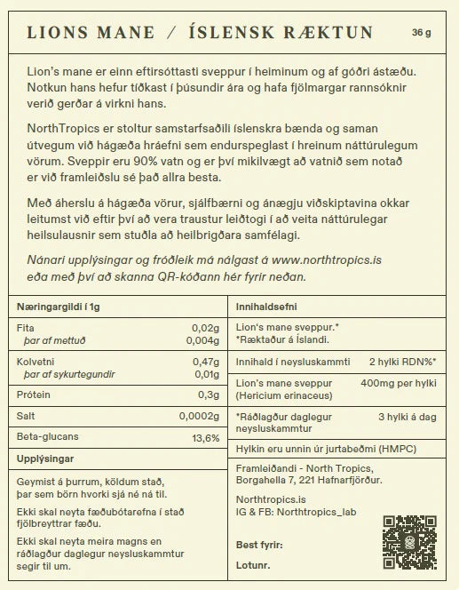 Lion’s Mane grown in Iceland supports the nervous system by stimulating the body’s natural production of nerve growth factor (NGF), helping enhance cognitive function and long-term brain health.
