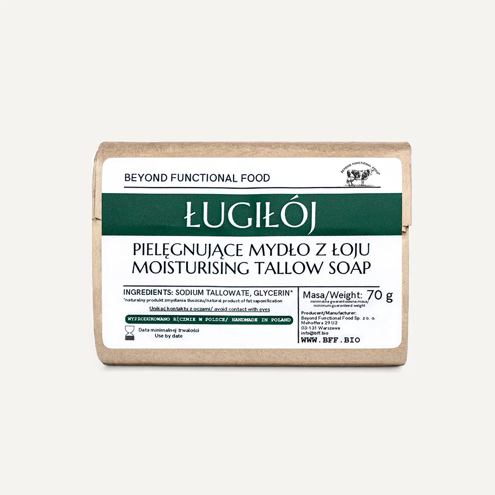 The name of the soap highlights both the simplicity of its two-ingredient recipe but also the beauty and resonance of our native Polish language (ŁUGIŁÓJ). We hope to shift any negative associations linked to tallow in the native tongue, celebrating its benefits instead.